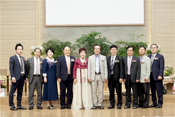 ▲입당예배를 마치고 임강원 담임목사 부부(맨 자운데)와 예배 위원들이 기념 촬영을 하였다.